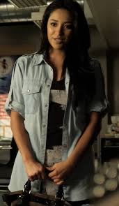 Emily Fields on the show, is played by Shay Mitchell. Her style out of the five main girls on the show is definitely the off casual. The first outfit is what Emily's styles is circled around. Combat boots, muscle tanks, and skinny jeans. On the show Emily is really often wearing denim shirts. Instead of pairing the denim shirt on denim, I chose a pair it with a pair of colored jeans. To tie the outfit together, at a pair of Emily's favorite combat boots.
